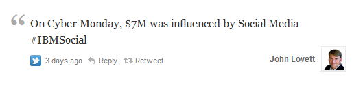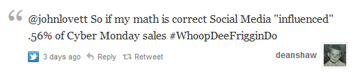 Having been flooded with Black Friday and Cyber Monday sales figures, my first thought was how small that $7M sounded compared to the $1.25B that was spent online that day. How small? Well .56% small. I thought it was curious that John would trumpet a number that frankly was about equal to the Cyber Monday sales that were influenced by my Mom’s bridge league. Being the sumbitch I am I responded: