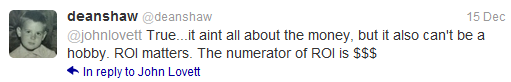The response this seemingly benign tweet started, prompted this blog post from John: Counting ROI in Pennies with Social Media, which deferred to the tired explanation that has always been given regarding social media and revenue – “It’s a method to engage with people on a meaningful level and to allow them to engage with one another.” Swear to God if I hear another “It’s not about the money. It’s about engagement”, I’m gonna stab myself in the ear with a fork. To me this explanation roughly translates to “Revenue? Oh this social media shit doesn’t drive revenue, but it’s a lot more fun than that other Marketing bullshit we do, and it’s the best explanation we got to keep doing it.”